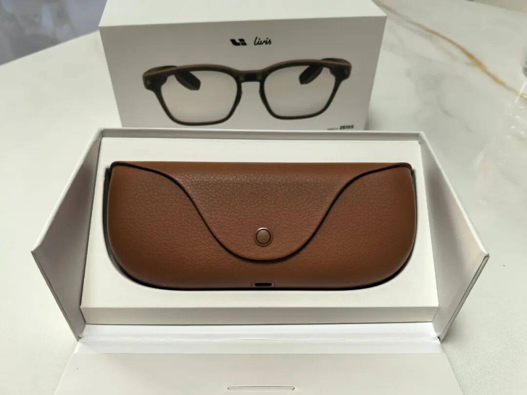 Livis配备的眼镜盒倒是挺有复古风,材质类似皮革。中部锁扣处是电量指示灯。充电时仅需将眼镜收起放置在里面即可。